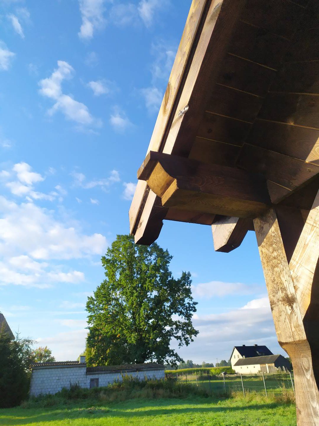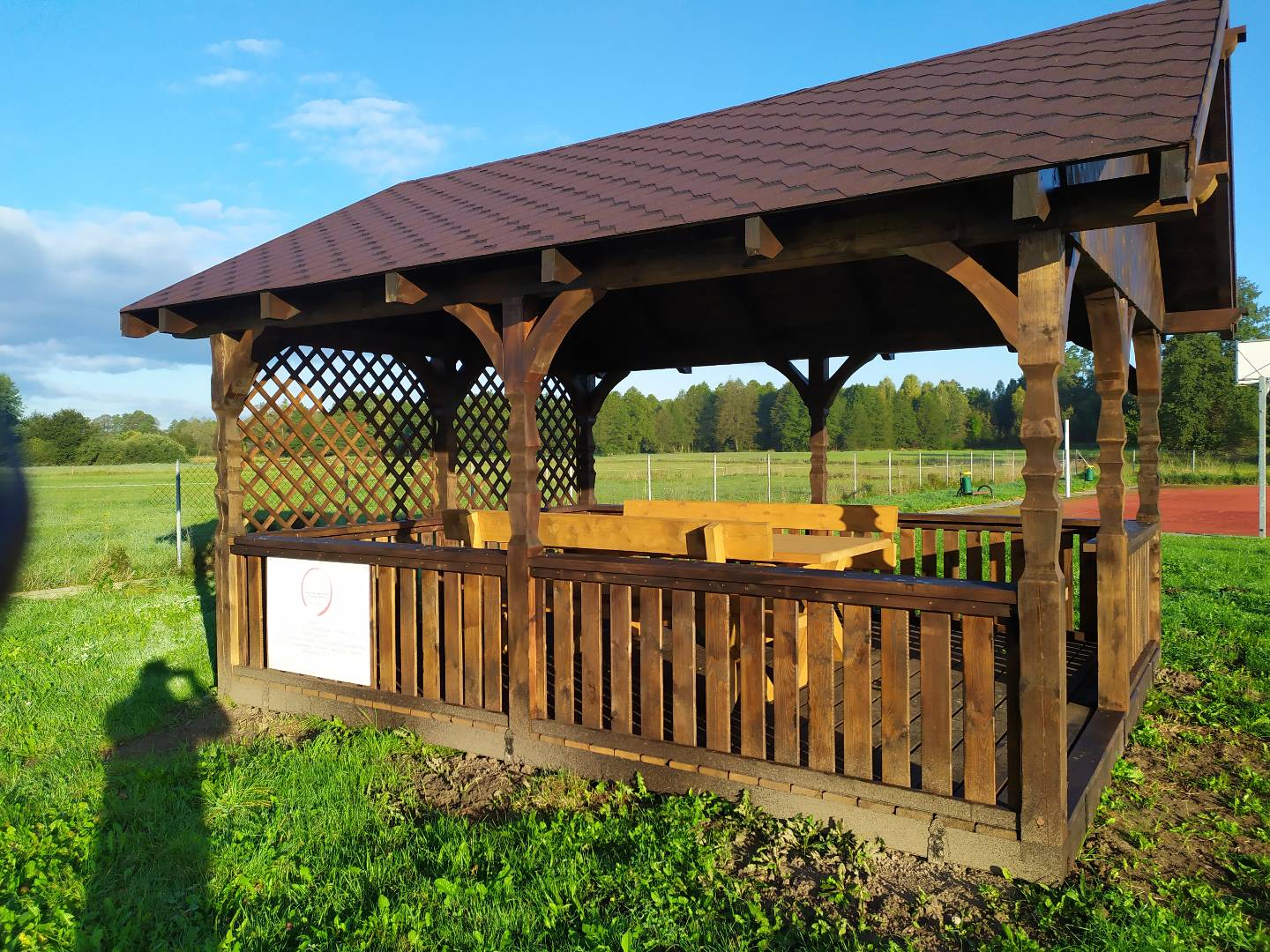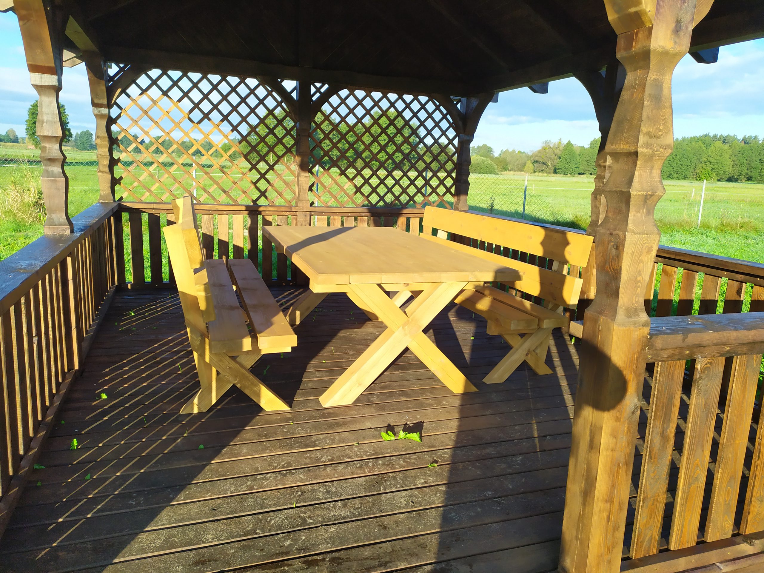 Altanka o wymiarach 4x5m. Słupy, miecze i murłaty 14x14cm rzeźbione. Podłoga drewniana z desek 3,2cm grubości.Parapety