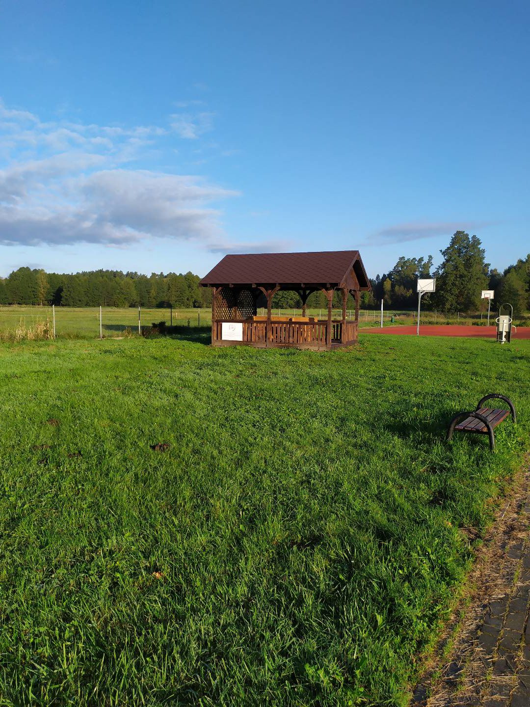 Altankla przykryta gontem. Zabezpieczona impregnatem do drewna w wybranym kolorze. Stolik i dwie ławki w cemie. Koszt budowy około 25 000zł.