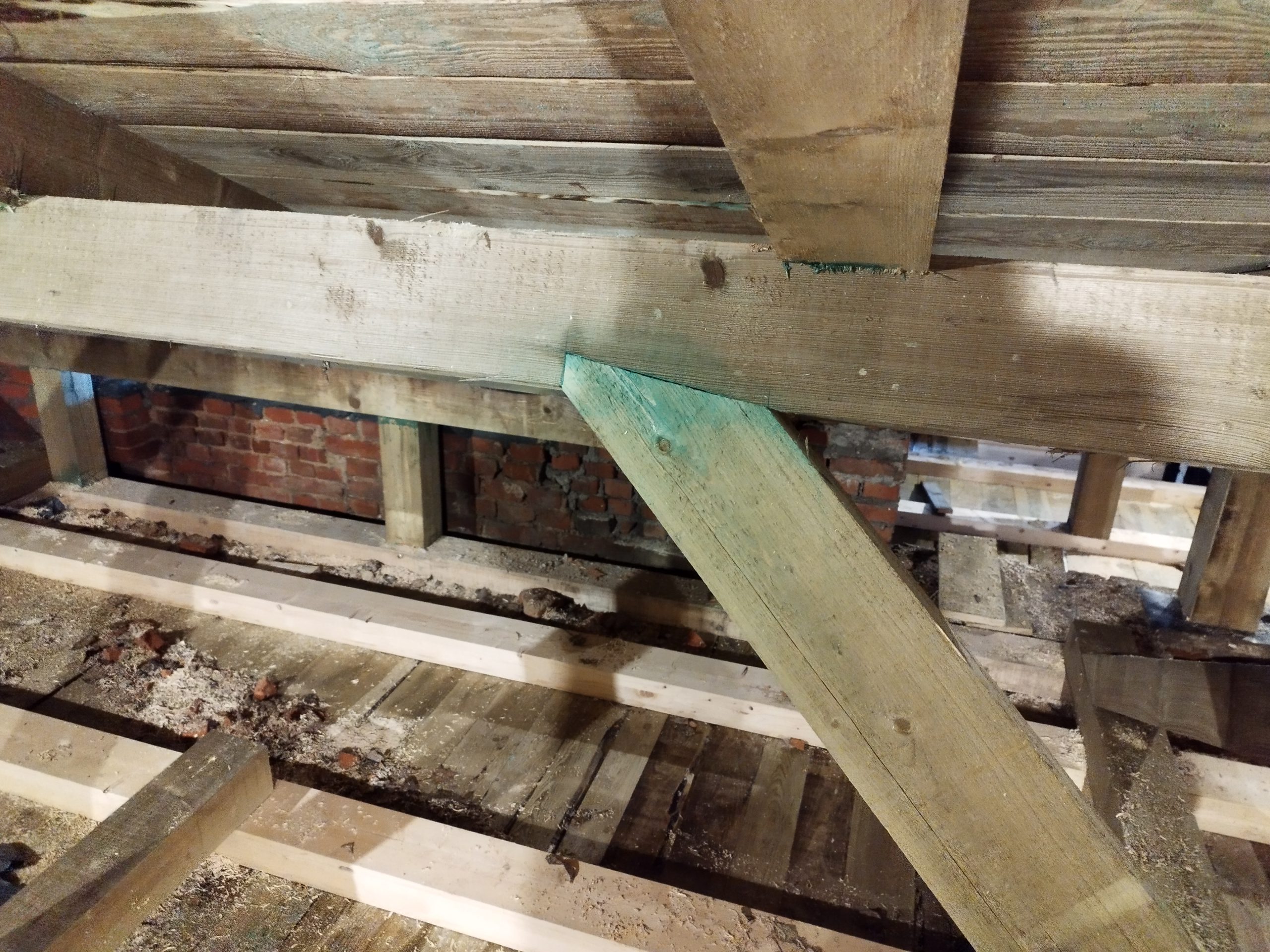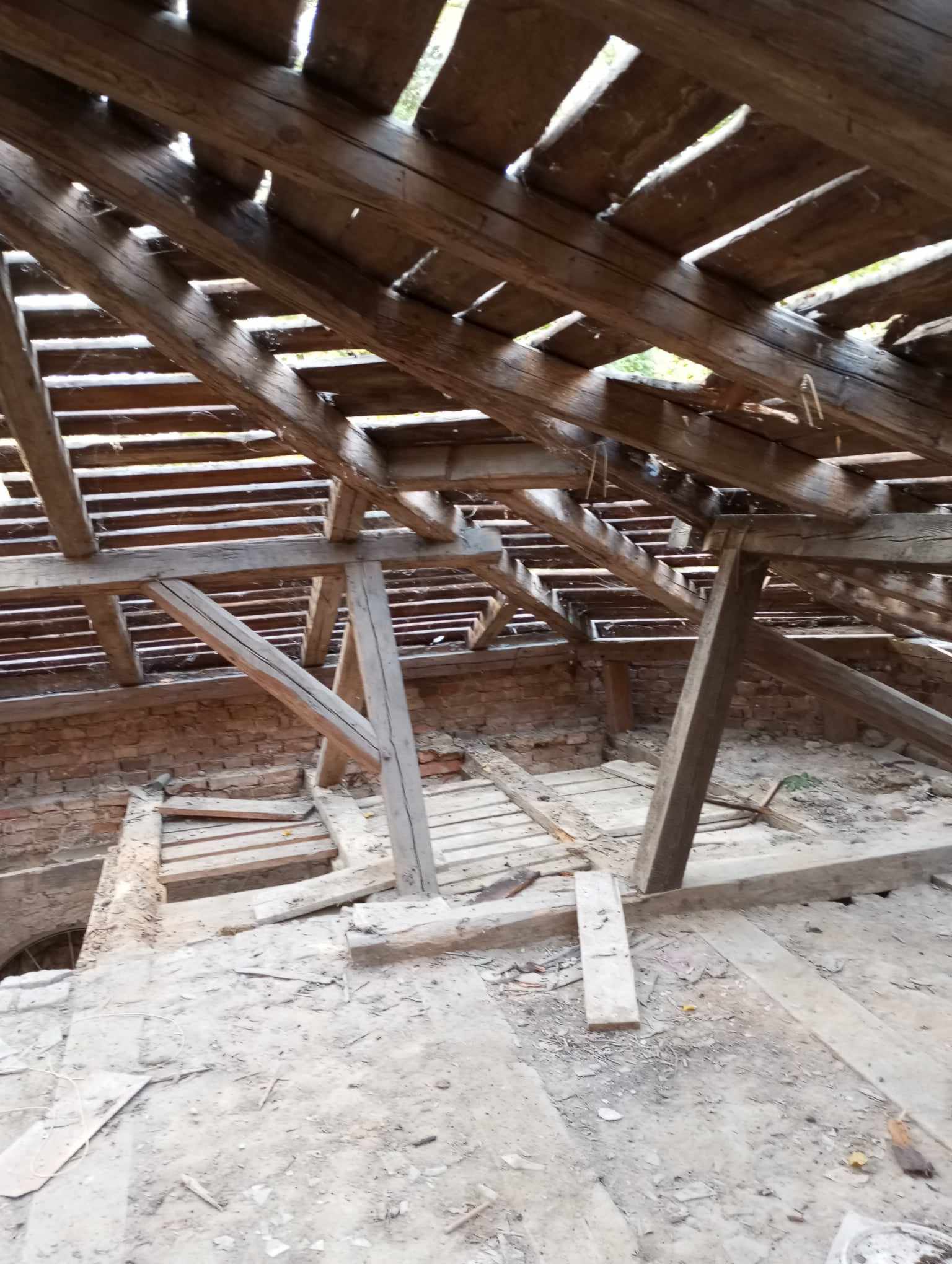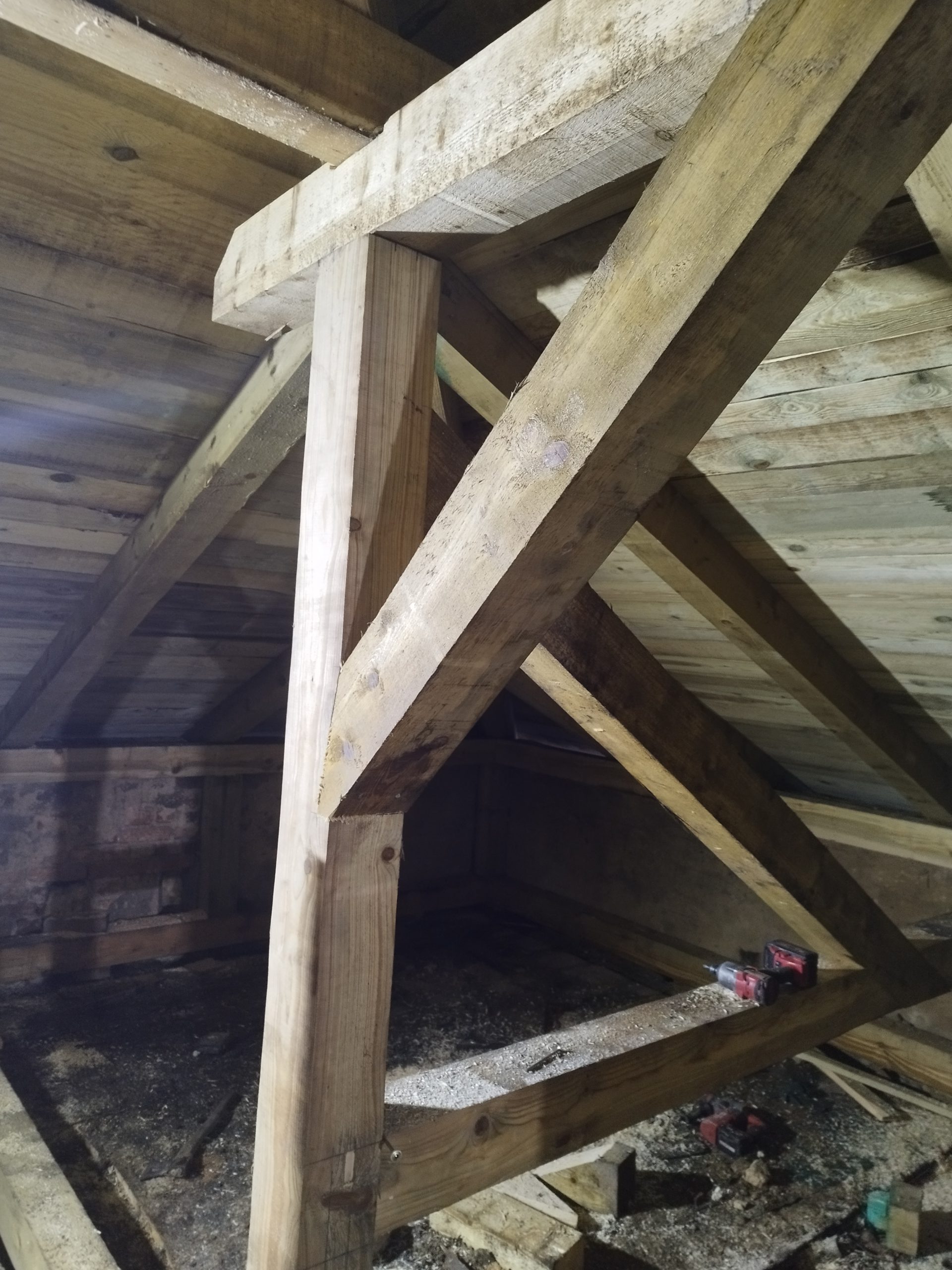 Kompleksowa Rekonstrukcja więżby Dachowej na zabytkowym Dworze w Nadułkach. Zakres prac obejmował demontaż starego poszycia rozebramie starej więżby dachowej, demontaż starego stropu,ułożenie nowego stropu, wykonanie nowej więźby dachowej w której tylko kilka elementów zostało zmienionych w stosunku do oryginału na prośbę inwestora oraz za zgodą konserwatora zabytów pełne deskowanie połaci oraz papowanie. Wszystkie prace przebiegały z zachowaniem szczególnej ostrożności o to aby budynek nie został zalany przez deszcze.